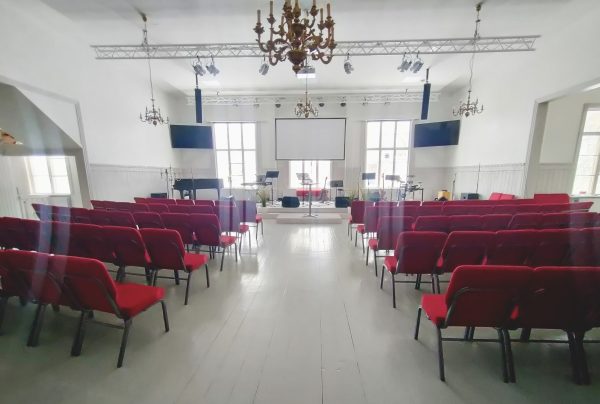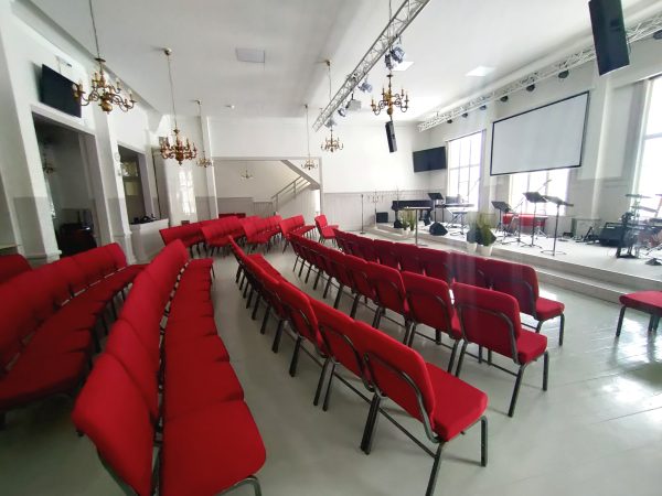 Vårt stora auditorium är utrustat med förstklassig ljud- och ljusanläggning, modern teknik för presentationer och livestreaming, samt en akustik som gör sig perfekt för både tal och musik. Lokalen lämpar sig utmärkt för konferenser, konserter, föreläsningar, filmvisningar eller gudstjänster.
